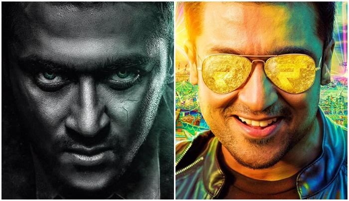 The first poster was dark and Suriya was posing with a slight evil grin. The second poster is very colourful with a yellow shade and the trademark smile from Suriya. Suriya's glasses show the Indian rupee symbol and the pink hook stud on his left ear is also noticed and appreciated by fans.